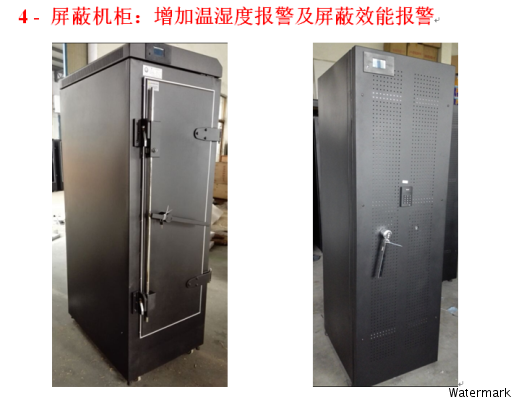 为保证屏蔽机柜的工作状态处于安全状态,机柜配置了开门报警装置。在机柜门被打开的时候报警器将发出报警声提示使用者应及时关闭机柜门。