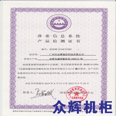 众辉屏蔽机柜2019年保密局C级认证新证出炉了!